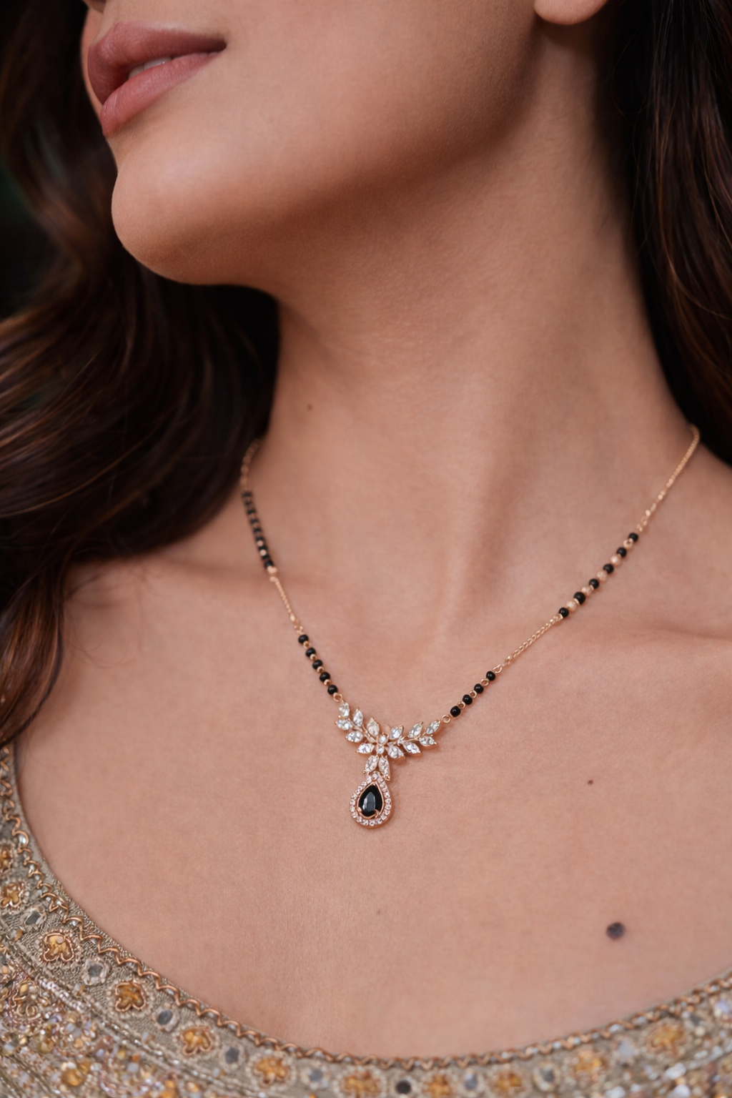 Grace meets tradition in the Noir Vanya Mangalsutra Necklace, crafted to celebrate timeless Indian elegance with a modern soul. Featuring a delicate black-beaded chain accented with a rose-gold finish, the centerpiece blooms with marquise-cut shimmering stones arranged like soft petals. A teardrop-shaped black stone pendant adds depth, contrast, and quiet drama. Perfect for festive occasions, weddings, or elevated daily wear, this mangalsutra is a symbol of love wrapped in refined luxury.