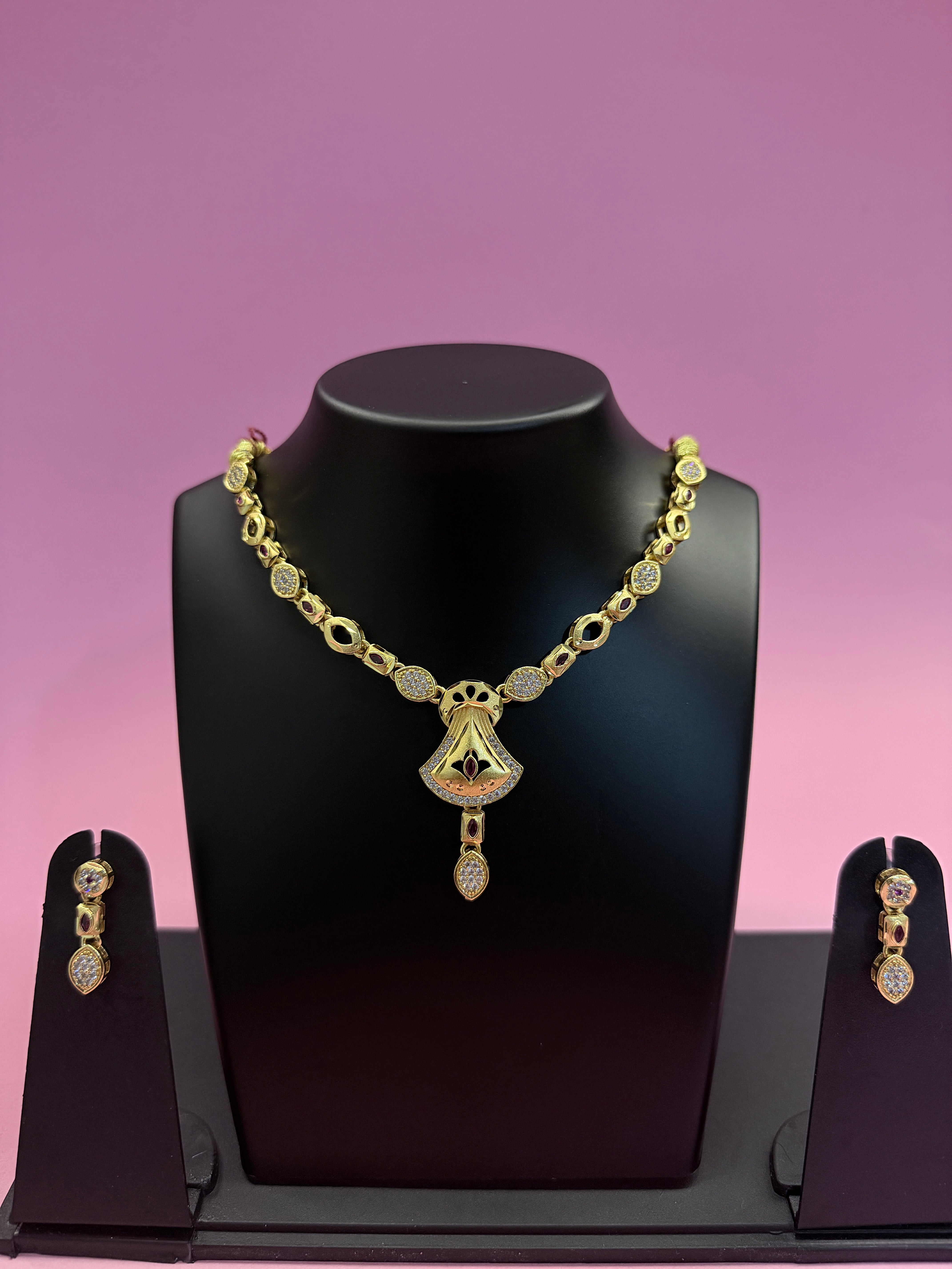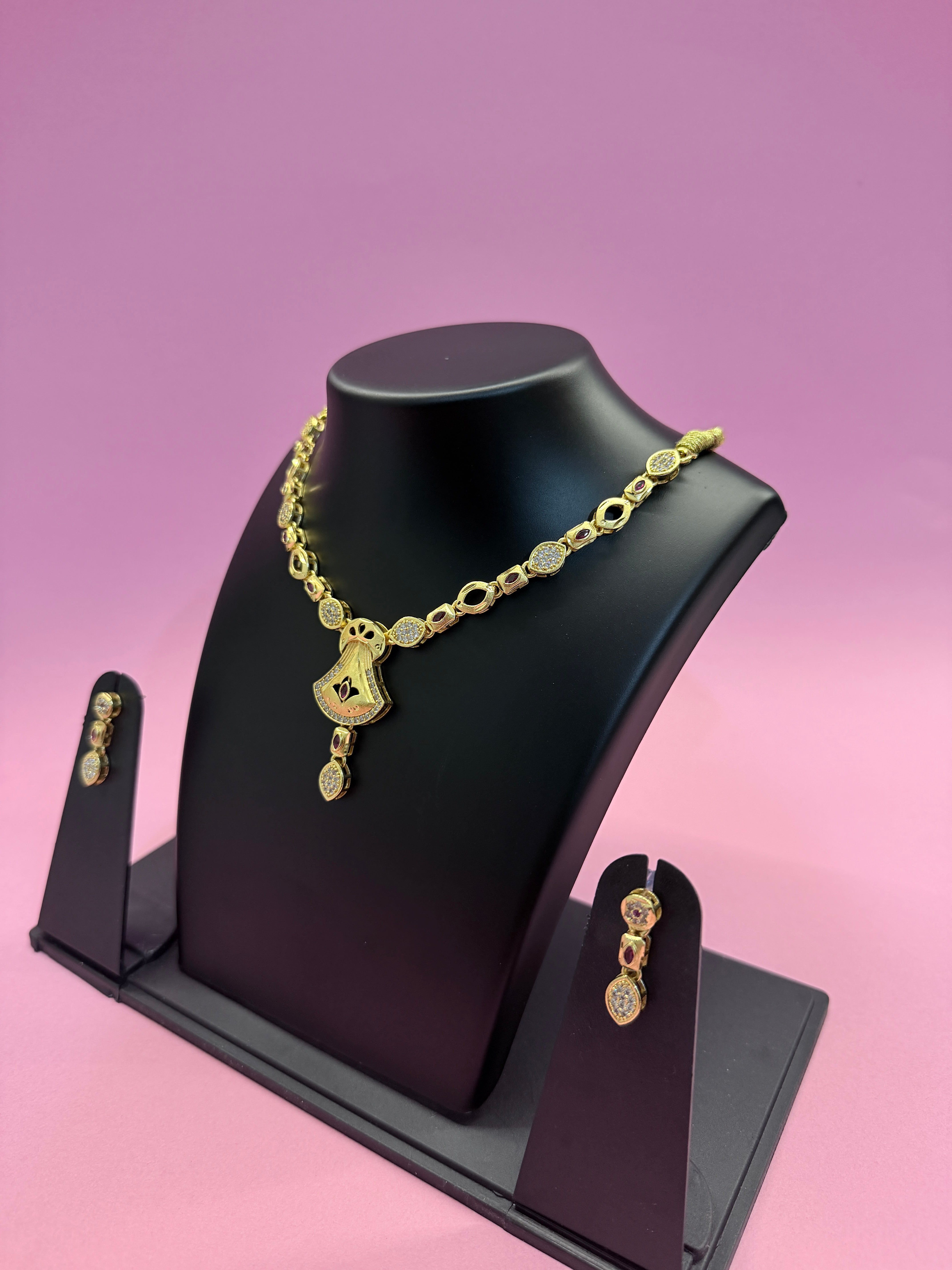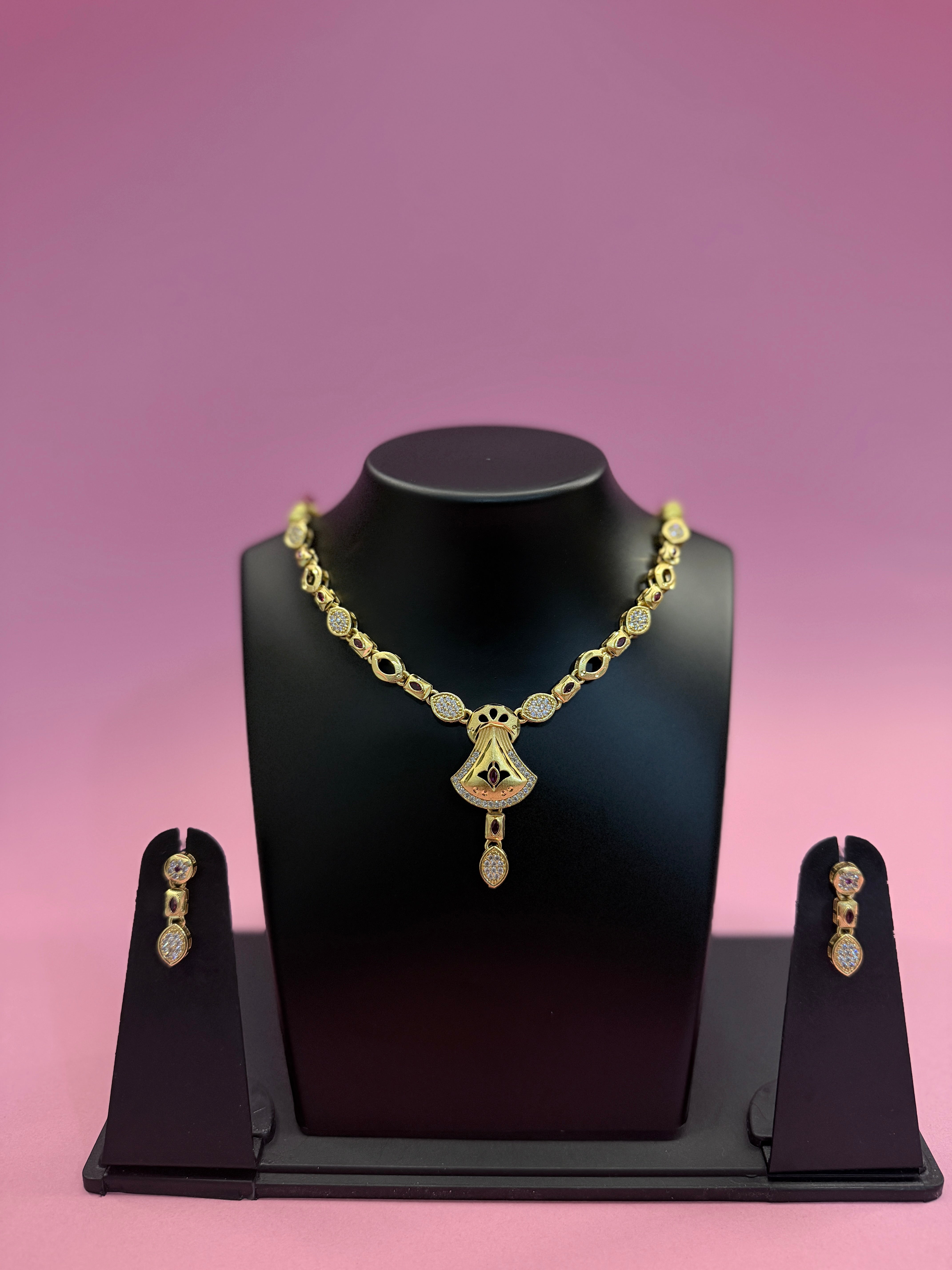 The statement pendant showcases graceful curves with detailed stone embellishments and a striking center accent, adding a royal touch to the design. Paired with matching drop earrings, this set offers a perfectly balanced look—subtle yet luxurious.