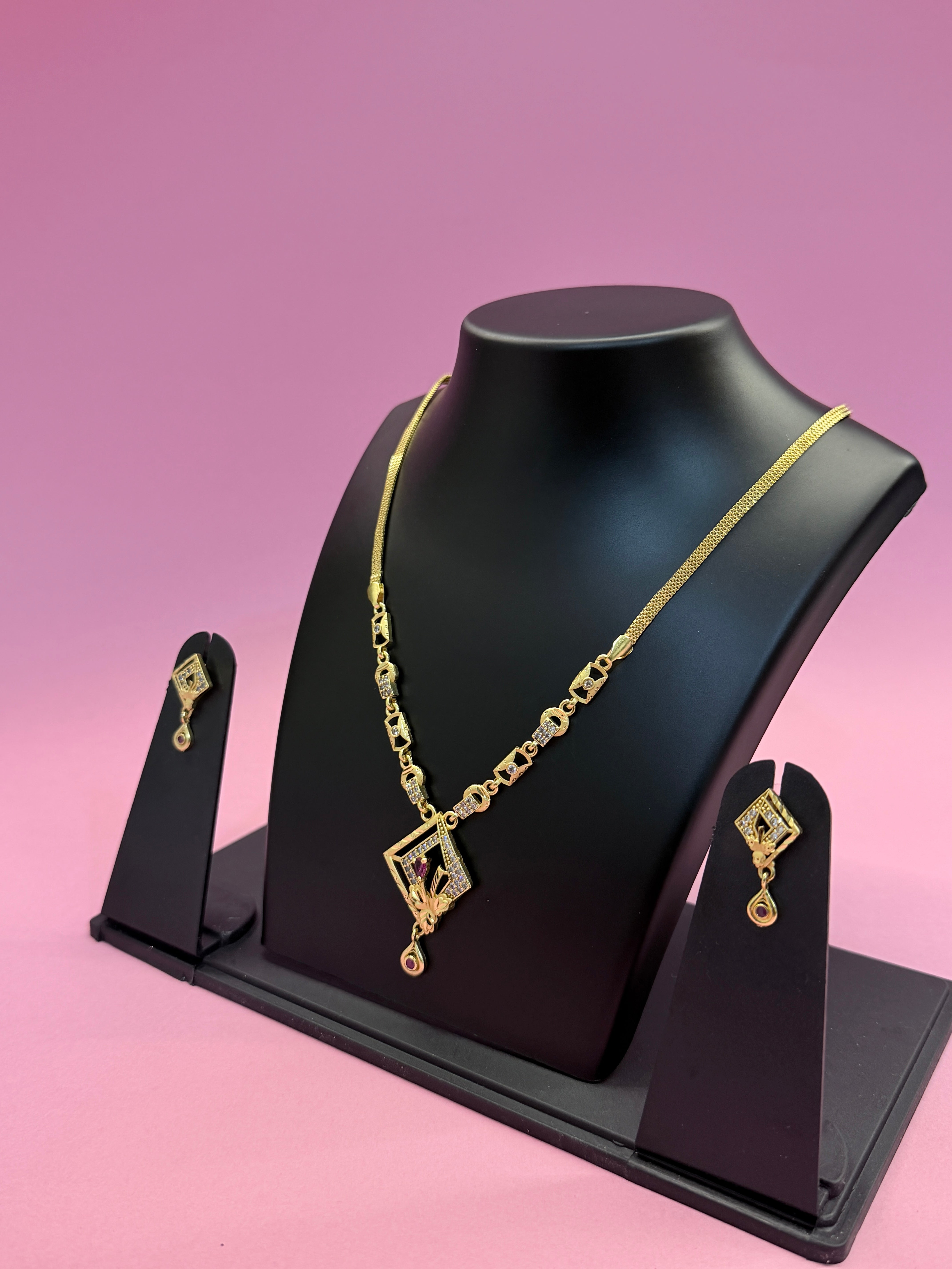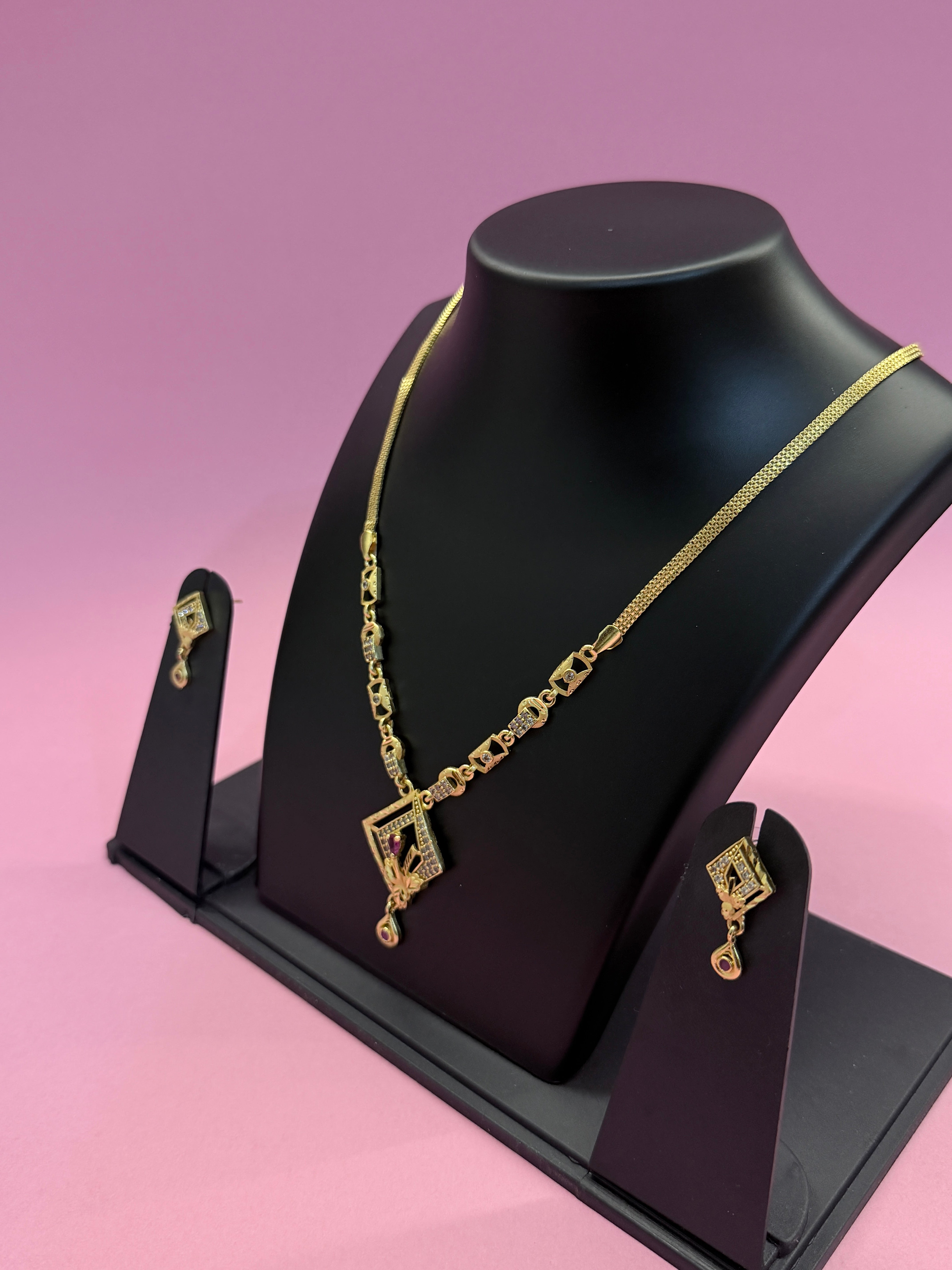 Elevate your elegance with this Geometric Gold Necklace Set, crafted to perfection for a timeless and graceful look. The necklace features a sleek gold-tone chain adorned with geometric motifs and a beautifully designed central pendant highlighted with fine stone detailing and a delicate drop accent.