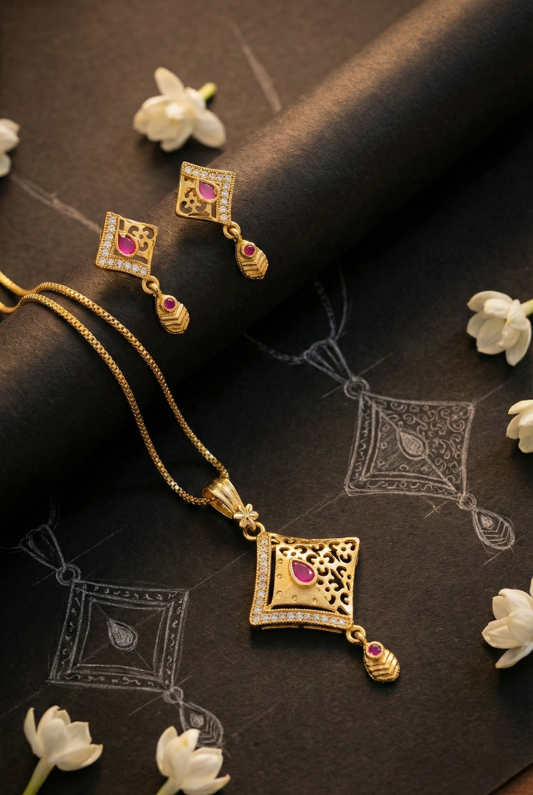 This set features a geometric diamond-shaped pendant with intricate cutwork detailing, highlighted by a delicate stone accent at the center and a graceful dangling drop that enhances its luxurious appeal. The matching earrings mirror the pendant design perfectly, creating a coordinated and sophisticated look.