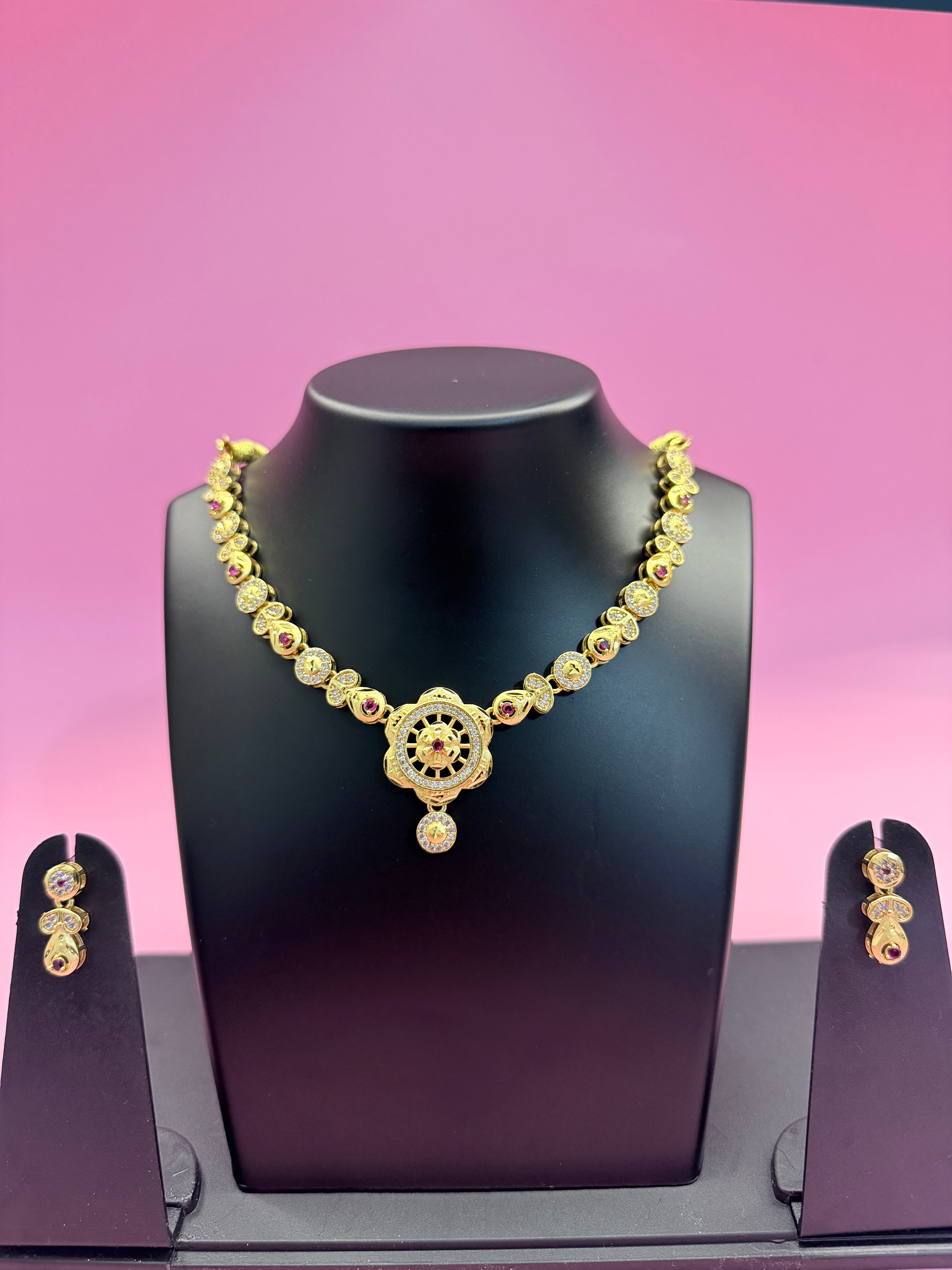 Elevate your elegance with the Royal Navratna Glow Necklace Set, a timeless creation crafted to reflect regal charm and modern sophistication. Designed with a radiant gold-tone finish, this necklace features finely set shimmering stones accented with rich ruby hues, leading to a beautifully detailed central pendant that adds a royal statement. Paired with matching earrings, this set is perfect for weddings, festive occasions, and grand celebrations. Its graceful design enhances both traditional and contemporary outfits, making it a versatile must-have for your jewellery collection