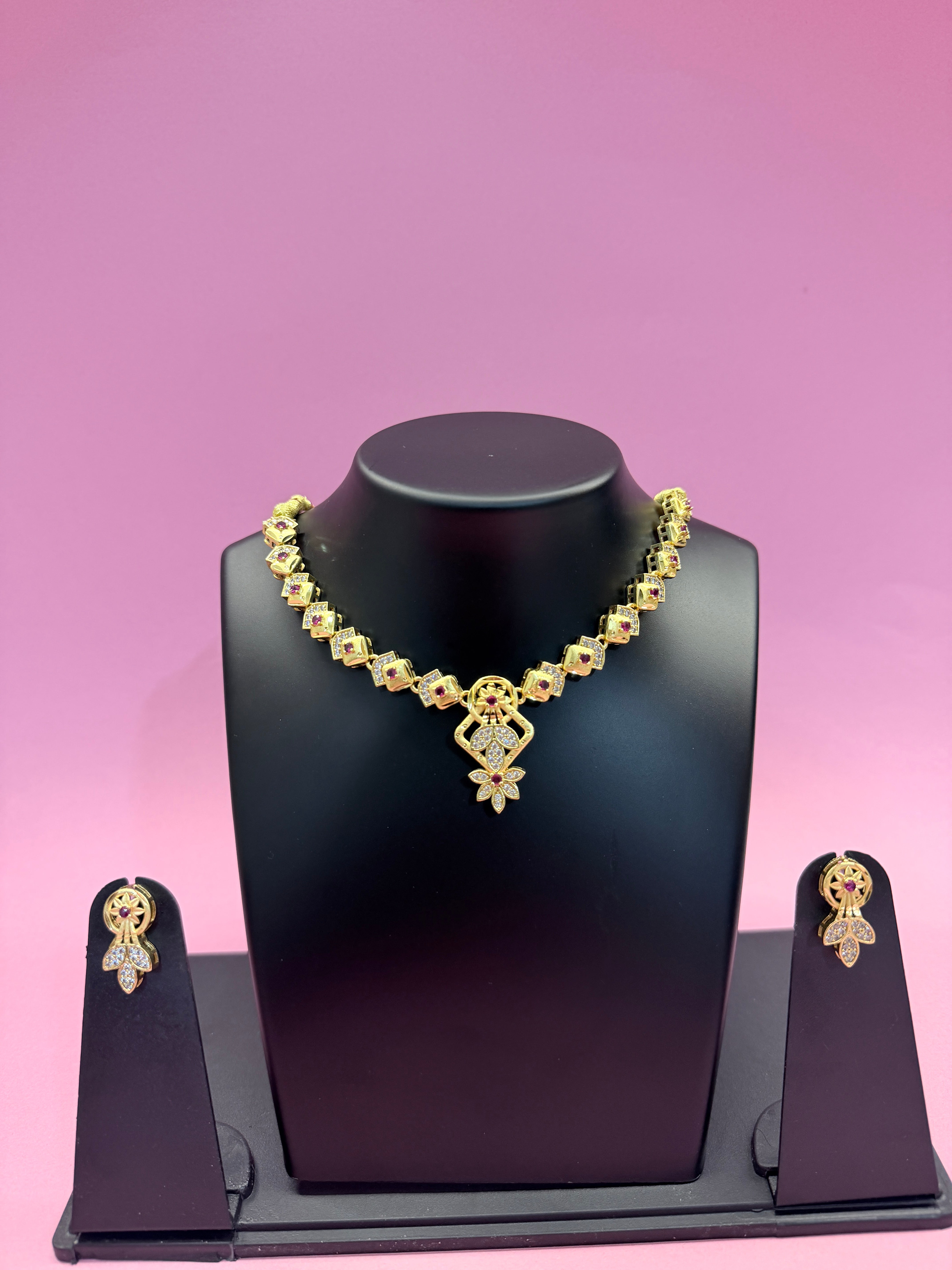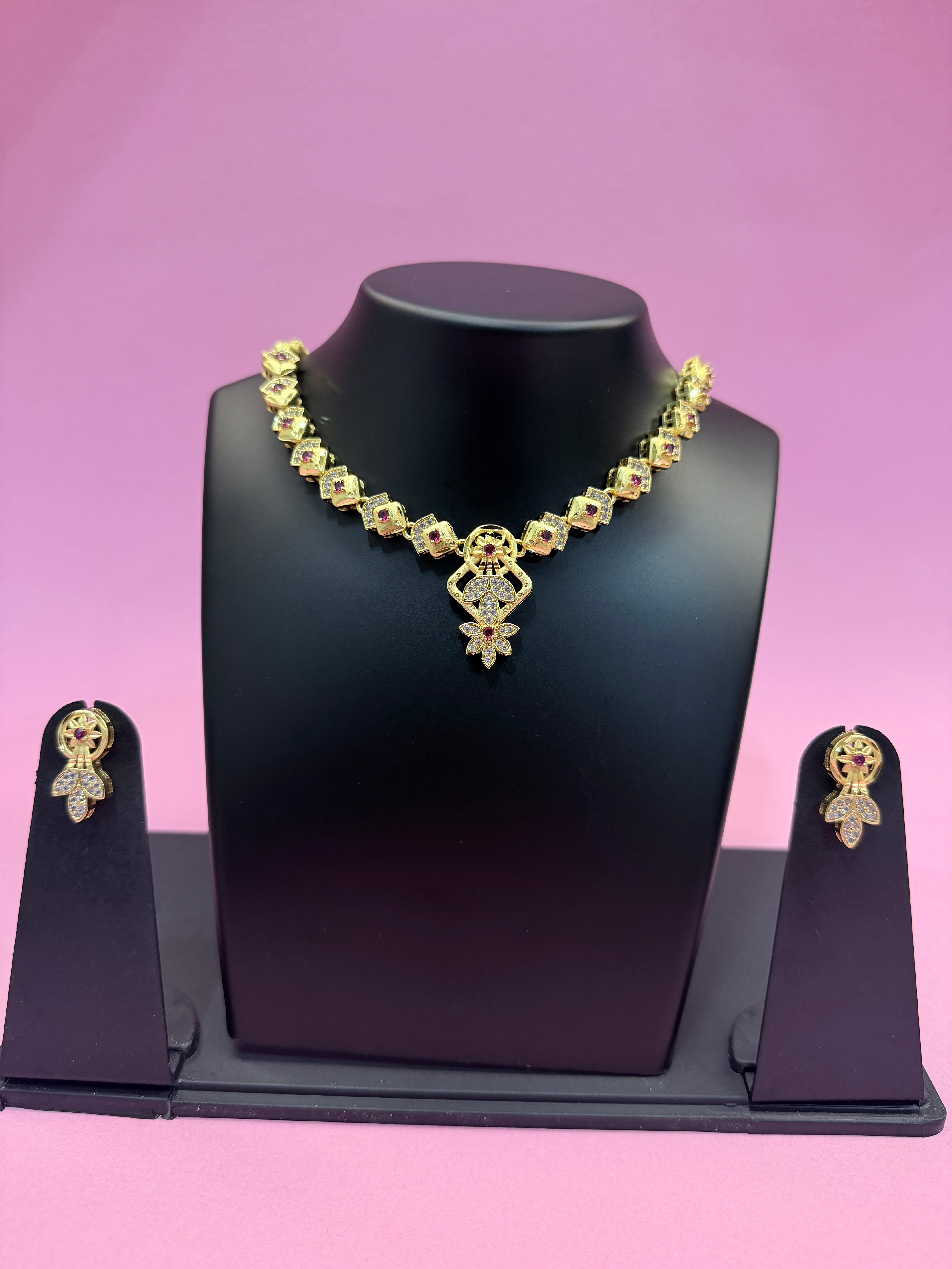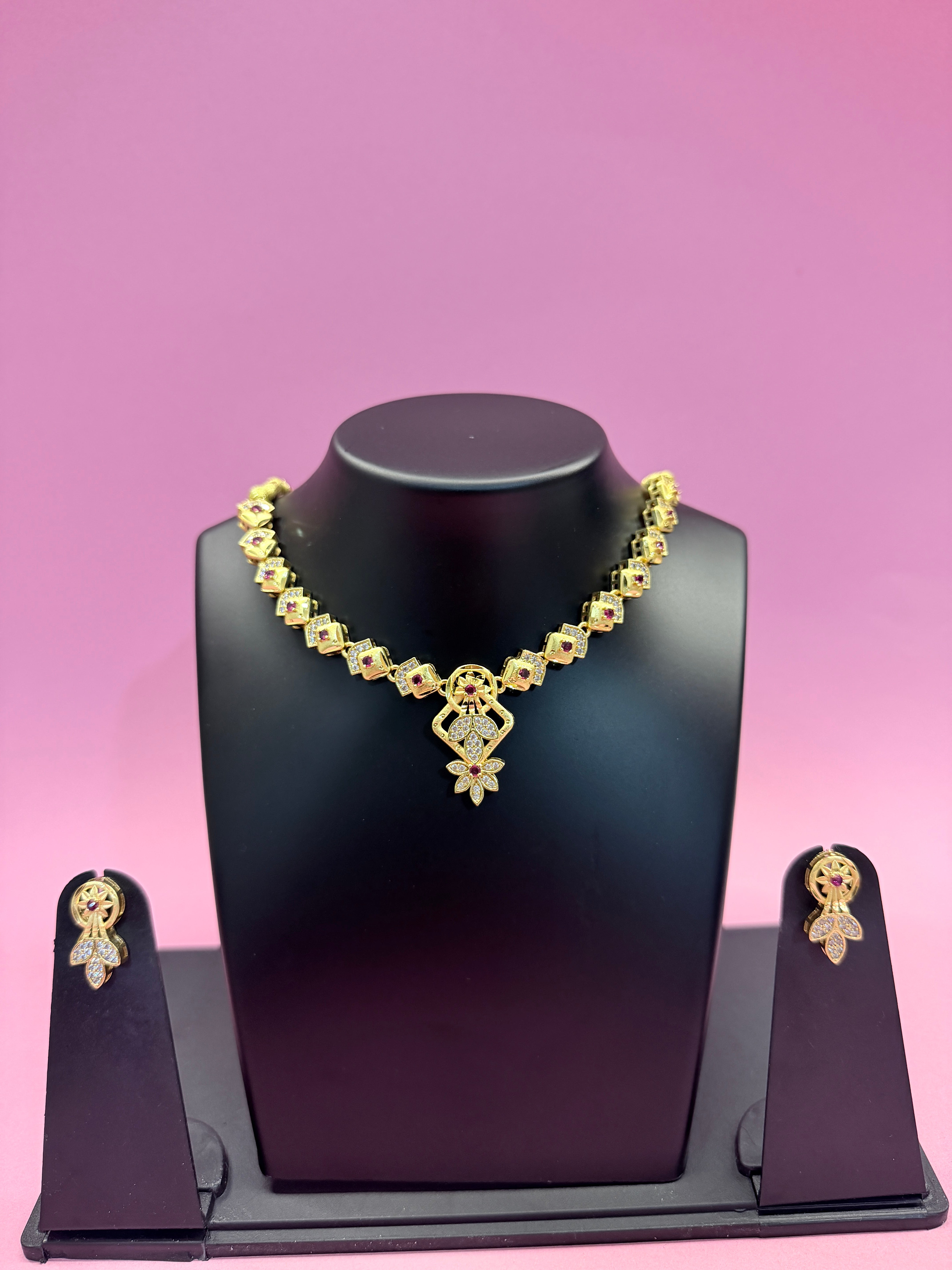 Elevate your elegance with the Regal Ruby Bloom Necklace Set, a timeless masterpiece crafted to reflect royal charm and refined artistry. Designed with a rich gold-toned finish, this necklace features a sequence of geometric motifs adorned with shimmering clear stones and deep ruby-hued accents, leading to a beautifully detailed floral pendant centerpiece.